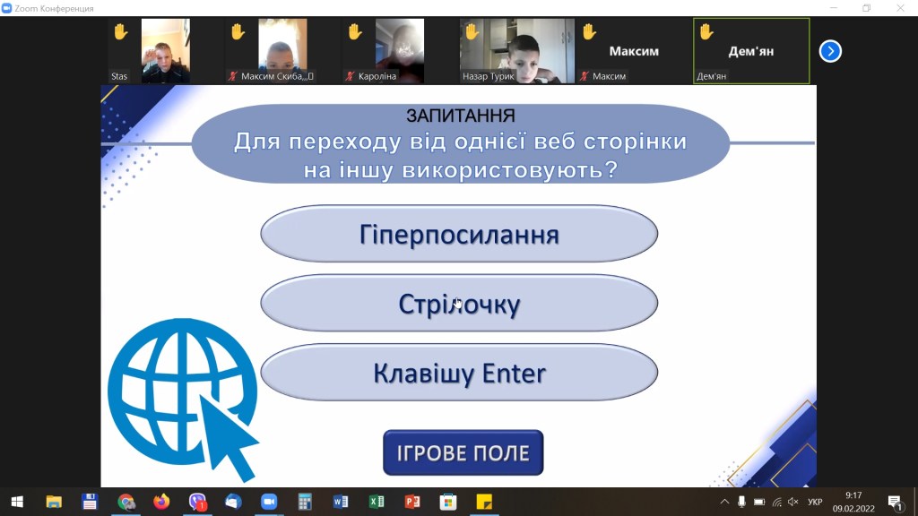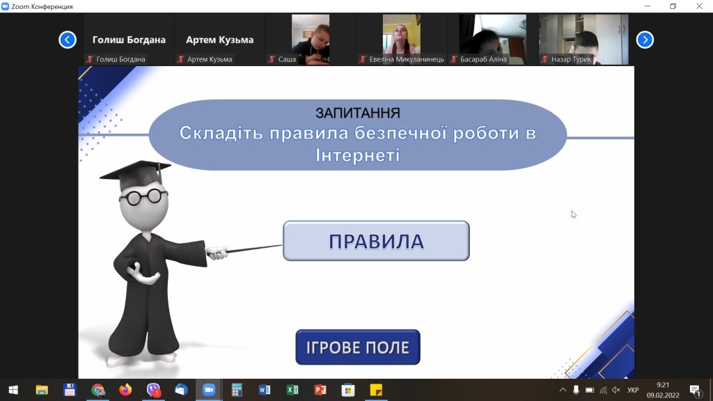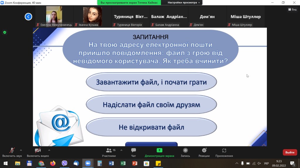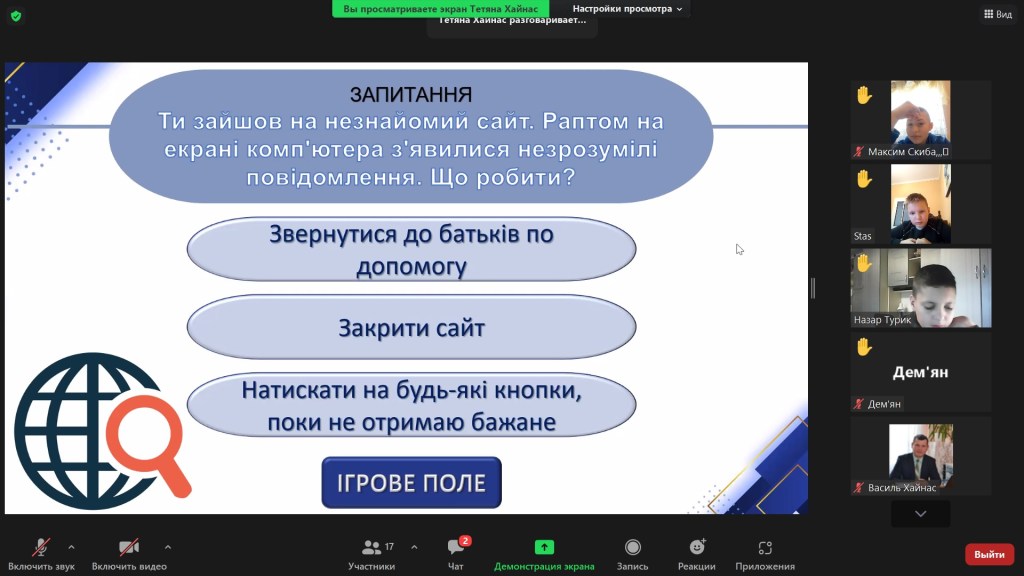 Вчителем інформатики Новодавидківської ЗОШ І-ІІІ ступенів Хайнас Тетяною Степанівною з учнями 6-х класів проведено онлайн гру-вікторину «Безпечний інтернет». Метою гри було ознайомити школярів з позитивним і негативним впливом Інтернету на людину, дати можливість учням самостійно прийняти ту позицію, до якої вони схиляються, сприяти розвитку самооцінки та самоаналізу як чинників, що спонукають до самовдосконалення особистості. В ході гри школярі мали можливість позмагатися у виконанні ряді завдань щодо безпечного користування мережею Інтернет.